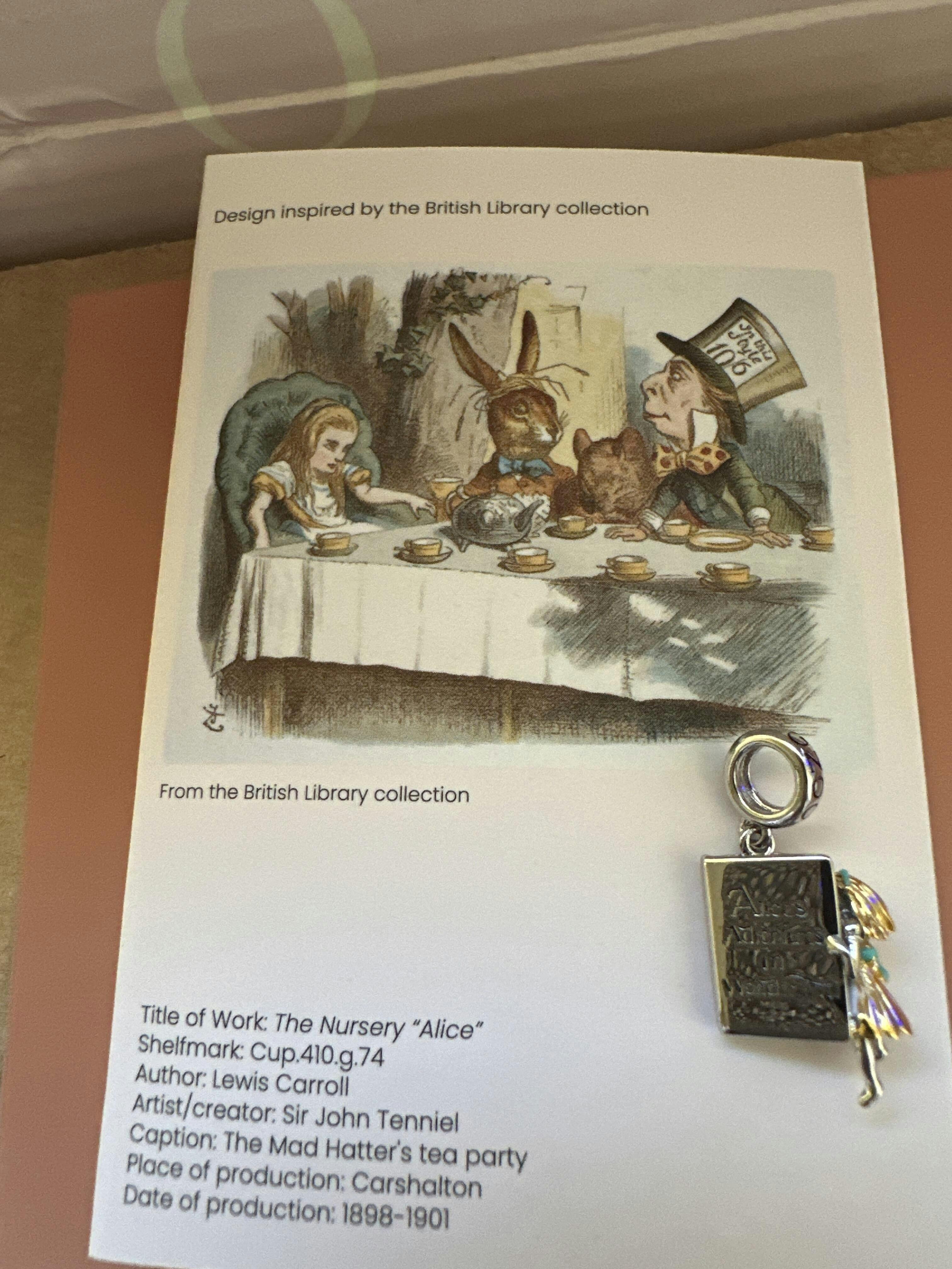 British Library Collection from The Nursey Alice is the Alices Adventures in Wonderland Book Pendant - colors and craftsmanship spot on Alice there is reading a Giant book color of hair dress and bow on dress beautiful.