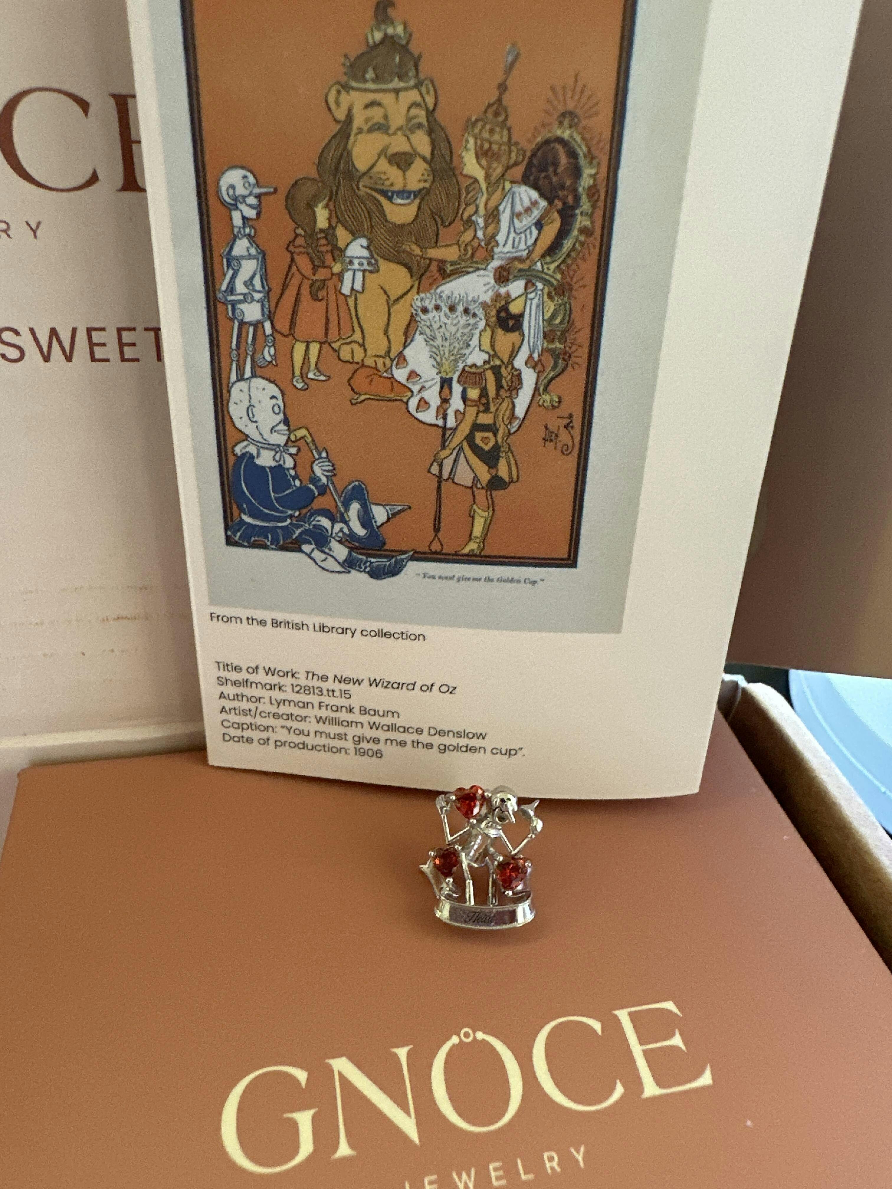From the British Library Collection - The New Wizard of Oz comes the Tin Woodmans Heart Charm theres red heart shape stones around the tinman and scribed on the bottom is HEART Magnificent
