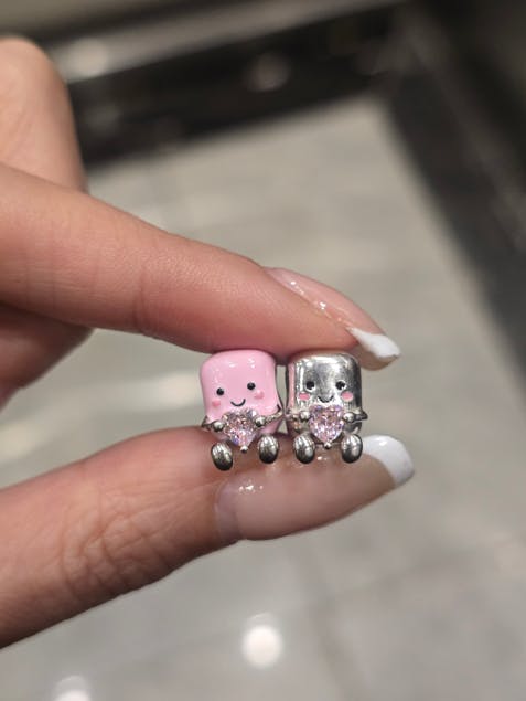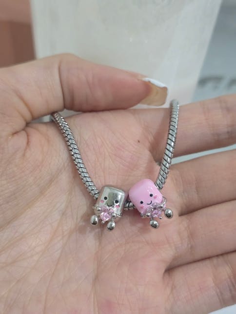 These little guys are so cute! This charming piece features two adorable marshmallows in soft cream pink and silver colors with cute blush accents. It can be customized with two birthstones, making it a perfect gift for sharing with a friend or loved one. This charm symbolizes friendship and sweetness, adding a playful touch to any jewelry collection.